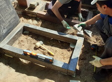 На фотографиях ниже видно промежуточное состояние места захоронения после укладки наземного покрытия и восстановления цветника.