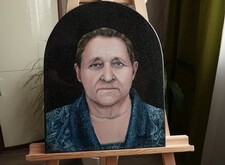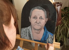 Сам же портрет наносится художником вручную. На приведённых ниже фото отображён поэтапный процесс рисования на граните: для начала камень покрывается специальной составом, затем медленно, начиная с одежды, вырисовываются детали. В заключении идёт углубление черт лица, так как без этого дополнения изображение на граните получится не реалистичным.
