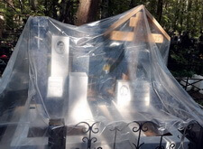 К сожалению, в самый разгар работы нас застал дождь. Так как реставрация требовала сухой погоды, то мы закрыли место захоронения плёнкой и покинули кладбище, отложив восстановление на несколько суток.