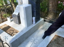 Так выглядело место захоронения на момент окончания работы: деревянный крест покрыт защитным раствором; мраморные изделия отшлифованы и покрыты гидрофобной субстанцией, стыки элементов промазаны белым герметиком; полые столбики, восстановлены; в цветнике заменена земля и посажен газон.