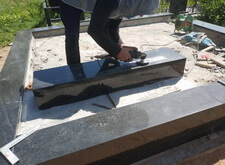 Приступаем к монтажу внутренней зоны мемориальной композиции. Создаём цветники, укладываем на территорию участка брусчатку, которую затем просыпаем пескобетоном. Оформляем ступеньки.